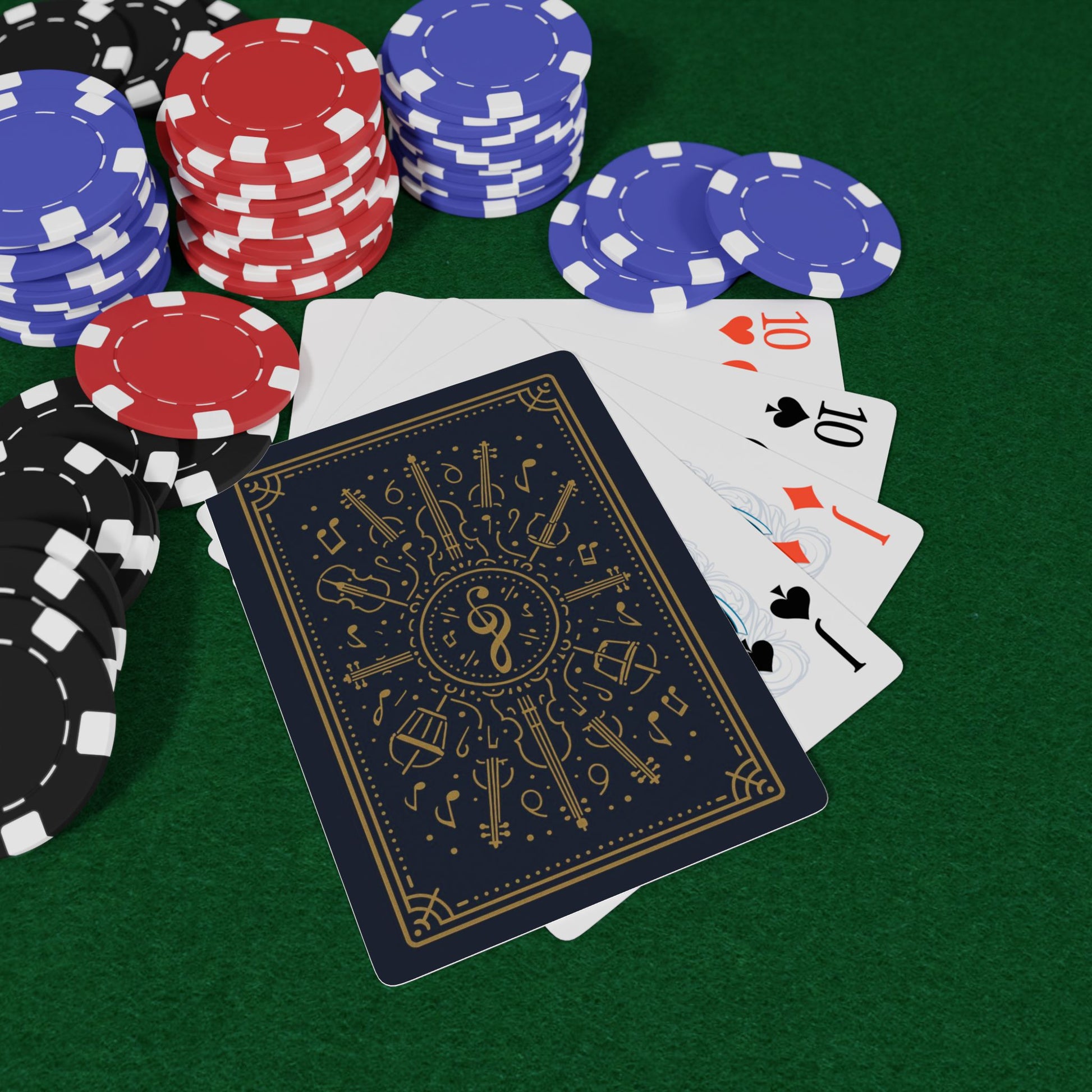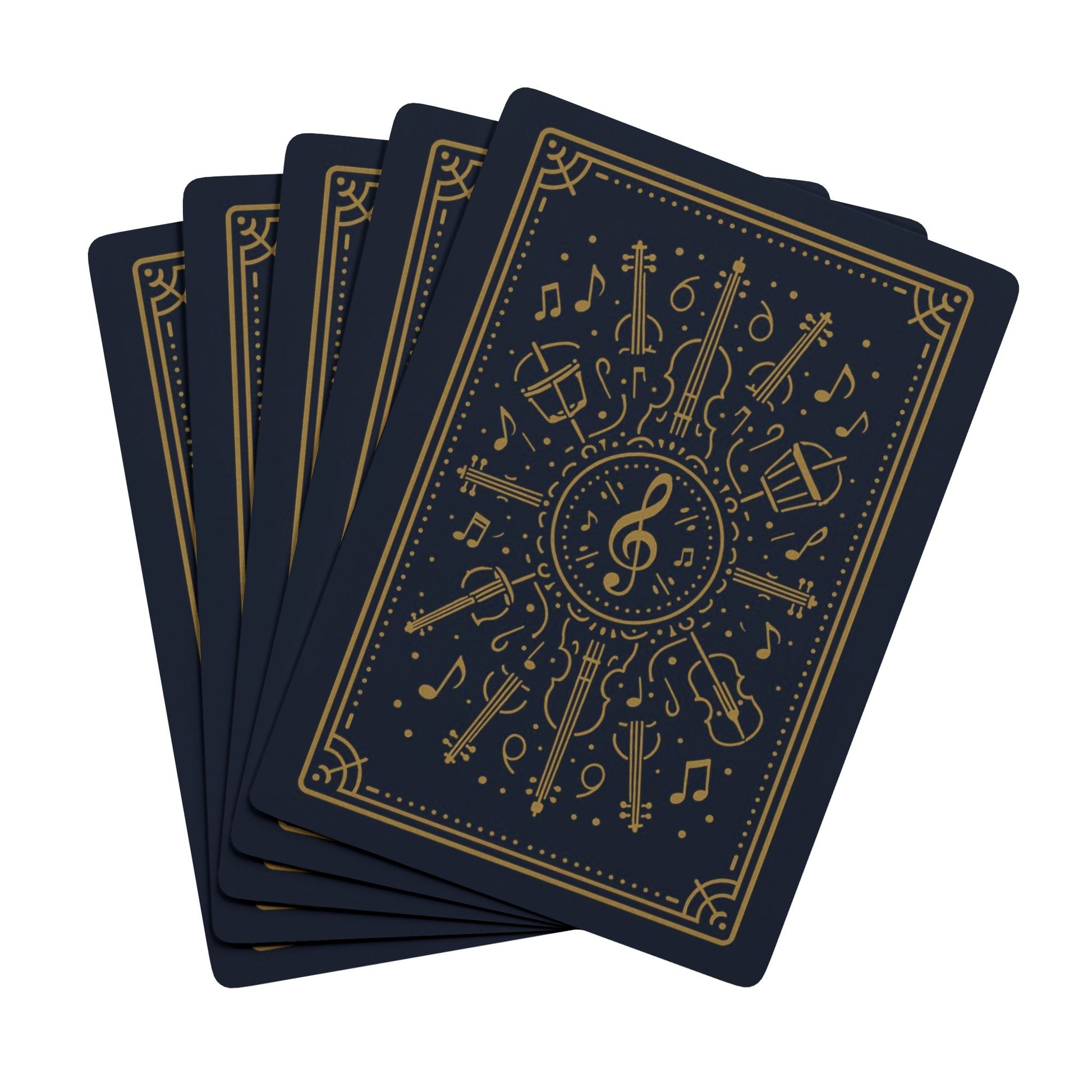 Bring harmony to your game nights with this exclusive Mandala Music Poker Deck. Featuring a stunning card-back design in deep navy and gold, the artwork showcases a central treble clef surrounded by trumpets, violins, drums, and musical notes arranged in perfect symmetry.