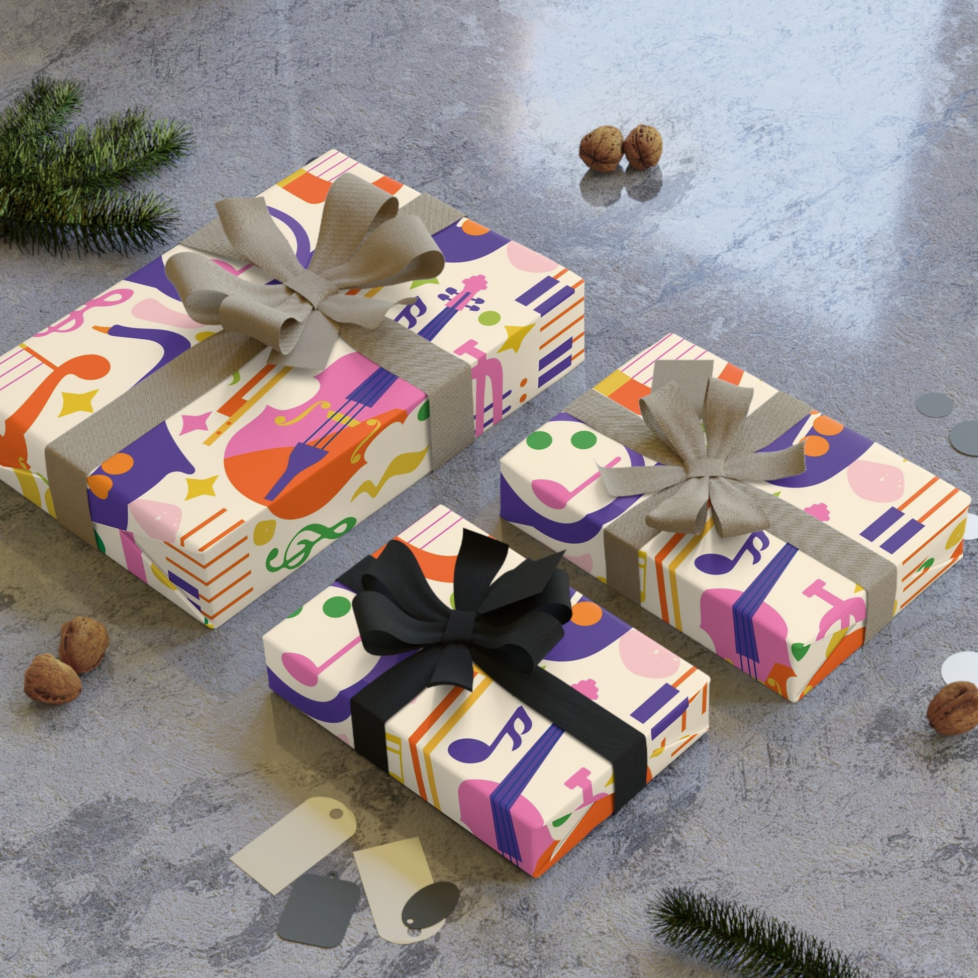 Wrap your gifts in pure joy. This vibrant, music-themed wrapping paper features a lively collage of instruments, notes, and playful shapes — perfect for band kids, music teachers, orchestra friends, or anyone who just lives life on the upbeat. The bold colors pop beautifully, giving every gift a little extra personality and flair.