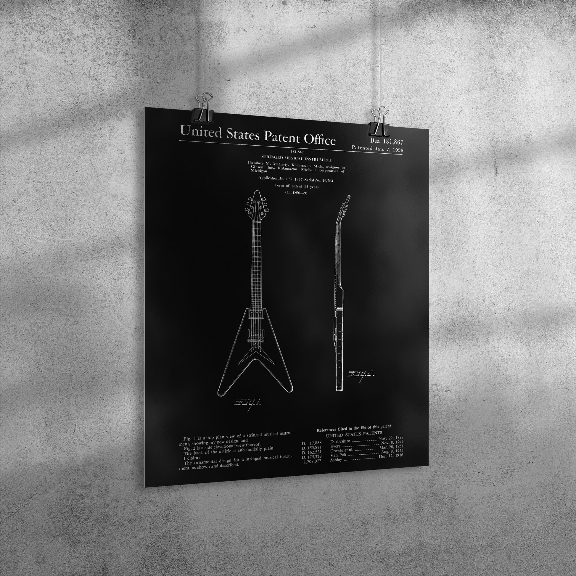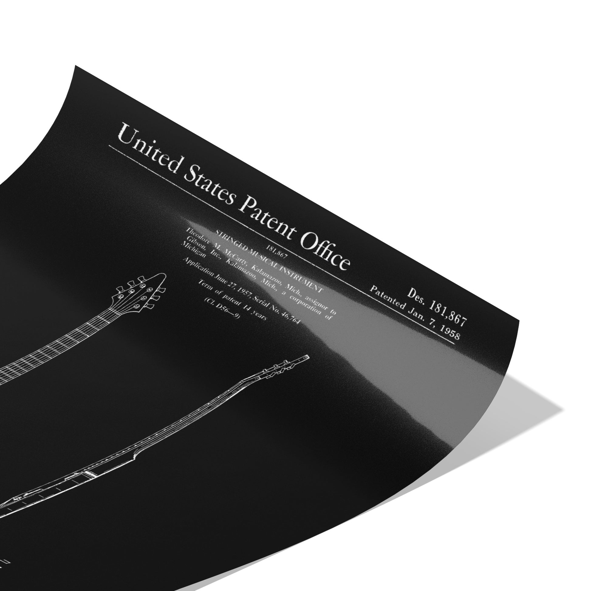 Ignite your passion for rock 'n' roll history with our electrifying Vintage Electric Guitar Patent Poster! Paying tribute to the revolutionary invention of the Electric Guitar by Theodore M. McCarty, patented on January 7, 1958, this poster is a testament to the iconic instrument that changed the course of music forever.